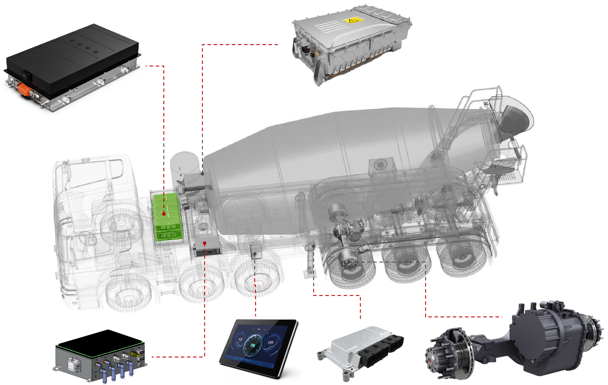 挂车匹配动力电池,解决上装供电,具备甩挂运营的能力解决搅拌运输市场等待时间长的问题,显著提升车队运输效率,降低每方运输成本